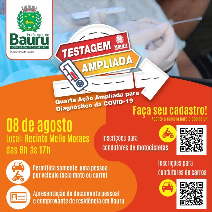 Vale ressaltar que continua a mesma regra de apenas uma pessoa por veículo (seja moto ou carro). A ação de aplicação de testes ocorre neste sábado (08), das 8 h às 17 h, no Recinto de Exposições Mello Moraes.