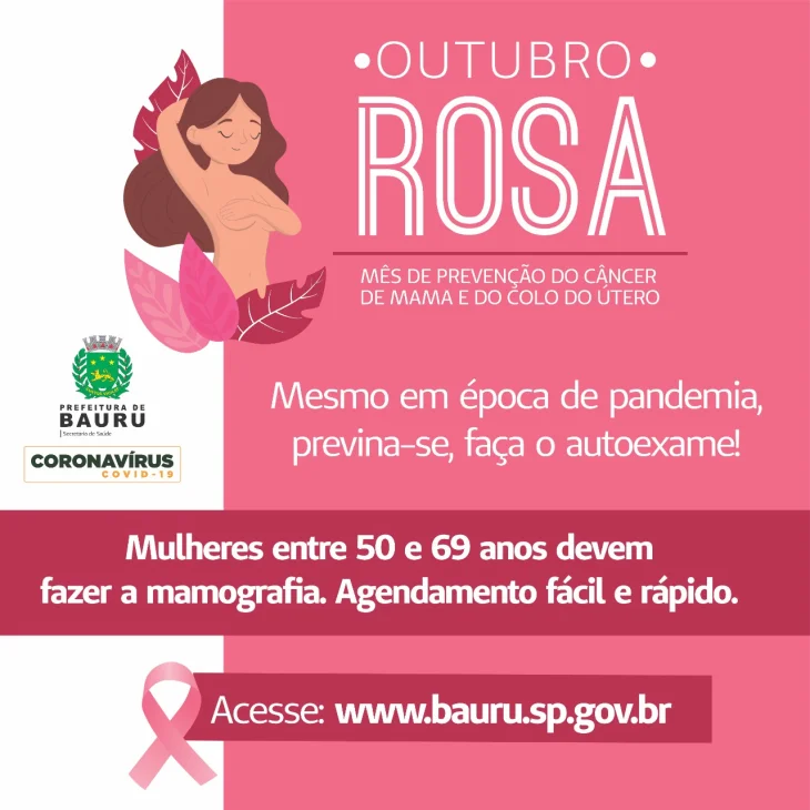 Mesmo com a pandemia da Covid-19, não se pode descuidar de outras doenças como o câncer de mama, por exemplo. Por isso a Secretaria realizará diversas ações neste mês, alertando às mulheres sobre a importância de fazerem o acompanhamento médico, e para aquelas que estão na faixa etária entre 50 e 69 anos, a realizarem a mamografia. A campanha terá ênfase no ambiente virtual e as ações serão individuais, com todas as medidas de segurança, evitando aglomerações.