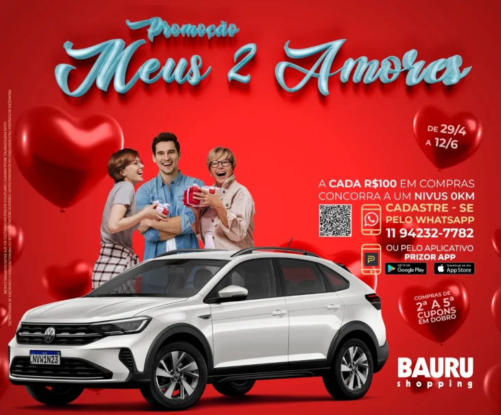 O Bauru Shopping, mais uma vez, sai na frente e lança uma grande campanha promocional, onde irá sortear um Volkswagen Nivus. A campanha denominada “Meus Dois Amores” começa hoje, dia 29 e vai até 12 de junho. O sorteio será realizado em 15 de junho.