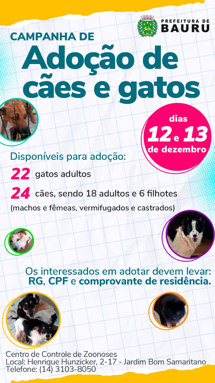 O Centro de Controle de Zoonoses (CCZ) realiza neste sábado e domingo, dias 12 e 13, Campanha de Adoção de cães e gatos. A ação ocorrerá das 9 às 12h no CCZ, localizado na Rua Henrique Hunzicker, Q.1 - s/n, Jardim Bom Samaritano. Os interessados em adotar devem levar RG, CPF e comprovante de residência.