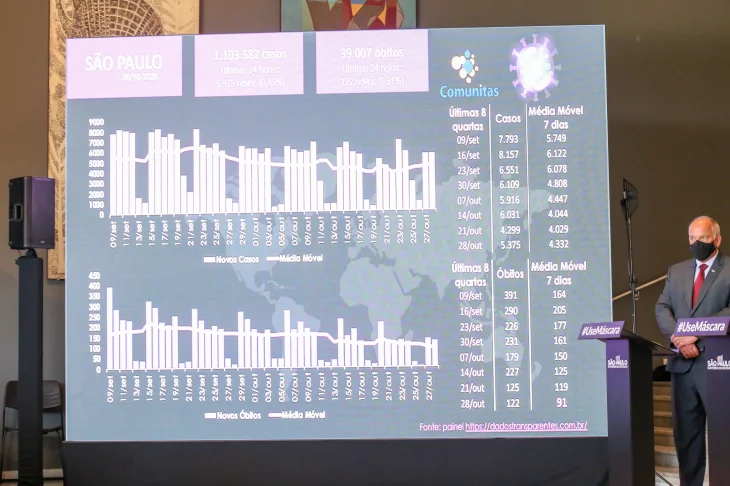 Em relação ao número de casos, a média móvel semanal em São Paulo vinha registrando quedas expressivas desde 16 de setembro, quando o índice chegou a 6.122. Depois, passou a 6.078 (23/9), 4.808 (30/9), 4.447 (7/10), 4.044 (14/10) e 4.029 (21/10). Nesta quarta, porém, a taxa voltou a subir para 4.332, mas ainda abaixo ao verificado no início de outubro.