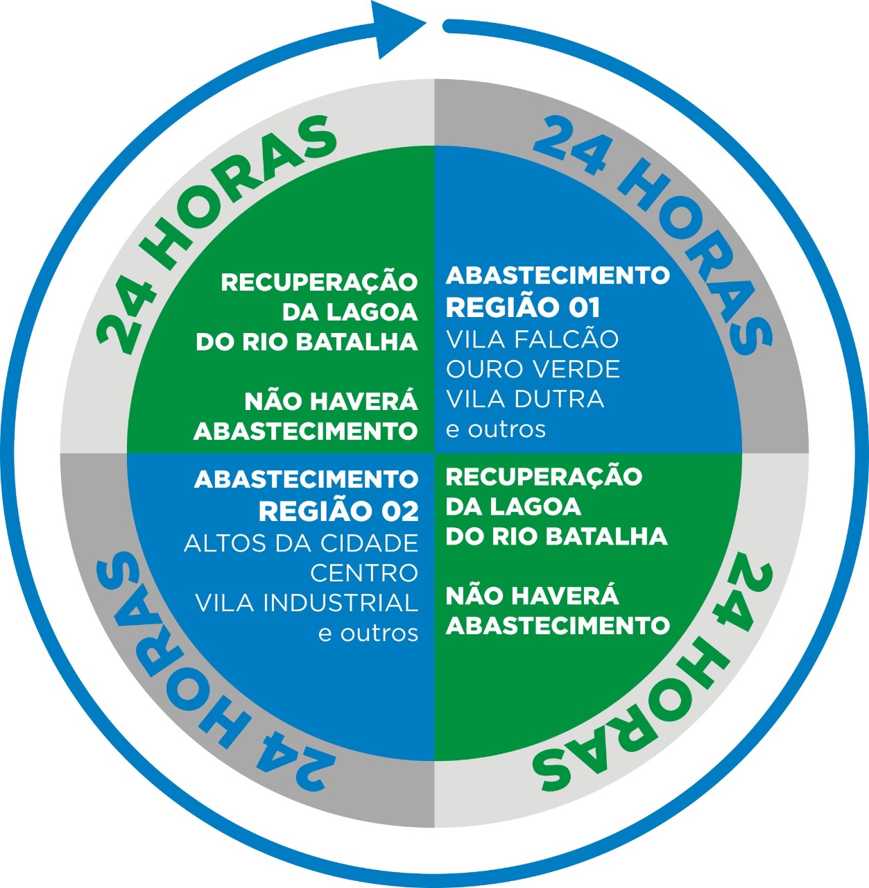 A partir desta quarta-feira (07), o abastecimento das regiões do Centro e Vila Falcão passa a funcionar da seguinte forma: serão 24h de abastecimento em uma parte dos bairros abastecidos pelo Batalha; seguidos por 24h sem abastecimento algum; mais 24h de abastecimento para o segundo setor de bairros, que não foi contemplado antes da pausa; e, por fim, outras 24h sem abastecimento.