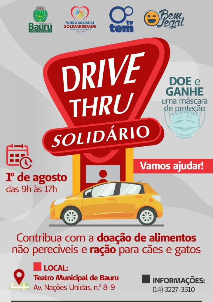 Neste sábado (01) a Prefeitura de Bauru, por meio do Fundo Social de Solidariedade e secretarias municipais e em parceria com o projeto "Bem Legal" da TV Tem, realizam o Drive-Thru Solidário para arrecadar alimentos não perecíveis e ração para cães e gatos.