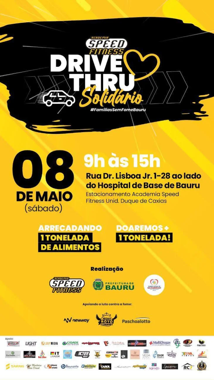O drive thru acontece neste sábado (8), das 9h às 15h, no estacionamento da Academia Speed Fitness, localizado na Rua Dr. Lisboa Jr. 1-28, ao lado do Hospital de Base de Bauru.