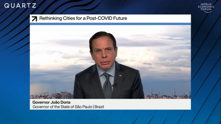 O Governador João Doria fez nesta terça-feira (26) a primeira participação na edição 2021 do Fórum Econômico Mundial de Davos na Suíça. Realizado em ambiente virtual devido à pandemia, o seminário colocou em pauta novas soluções para o progresso urbano. Em videoconferência, Doria afirmou que a vacinação contra o coronavírus marca o início de uma agenda de prosperidade e protagonismo das cidades em longo prazo.