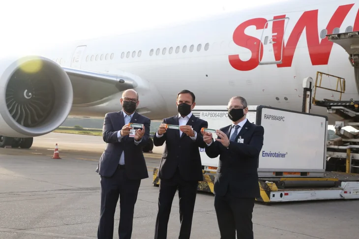 O embarque dos insumos aconteceu na quarta-feira (2) em Pequim, em um voo comercial da Swiss Air Lines que fez escala em Zurique, na Suíça, antes do desembarque no Brasil, na manhã desta quinta-feira, no Aeroporto Internacional de Guarulhos.