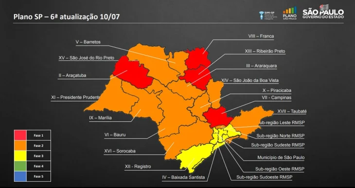 O Governo do Estado de São Paulo anunciou nessa sexta-feira (10) a reclassificação do Plano São Paulo e prolongou um novo período de quarentena — que vai de 15 de julho até 30 de julho. “Hoje, cerca de 83% estão na Fase 2 – Amarela ou 3 – Laranja. Isso mostra o Plano São Paulo dando resultados importantes”, avalia o secretário de Desenvolvimento Regional, Marco Vinholi. Ele acrescentou que as quatro regiões que estão na Fase 1 – Vermelha estão recebendo investimentos para melhorar a situação dos hospitais no atendimento aos pacientes com Covid-19.