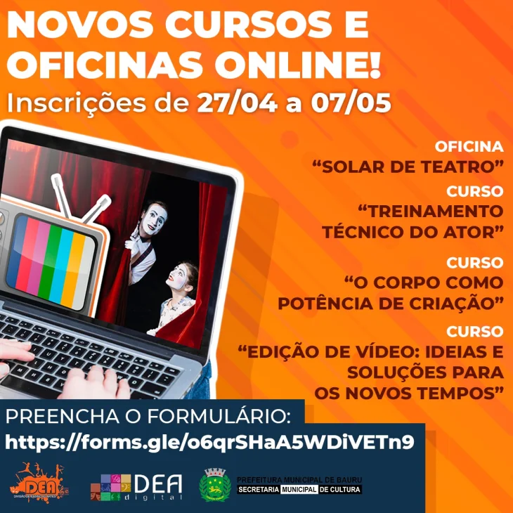 As inscrições para os novos cursos e oficinas online oferecidos pela Divisão de Ensino às Artes terminam nesta sexta-feira (7). Os interessados devem se inscrever por meio do link https://forms.gle/o6qrSHaA5WDiVETn9.