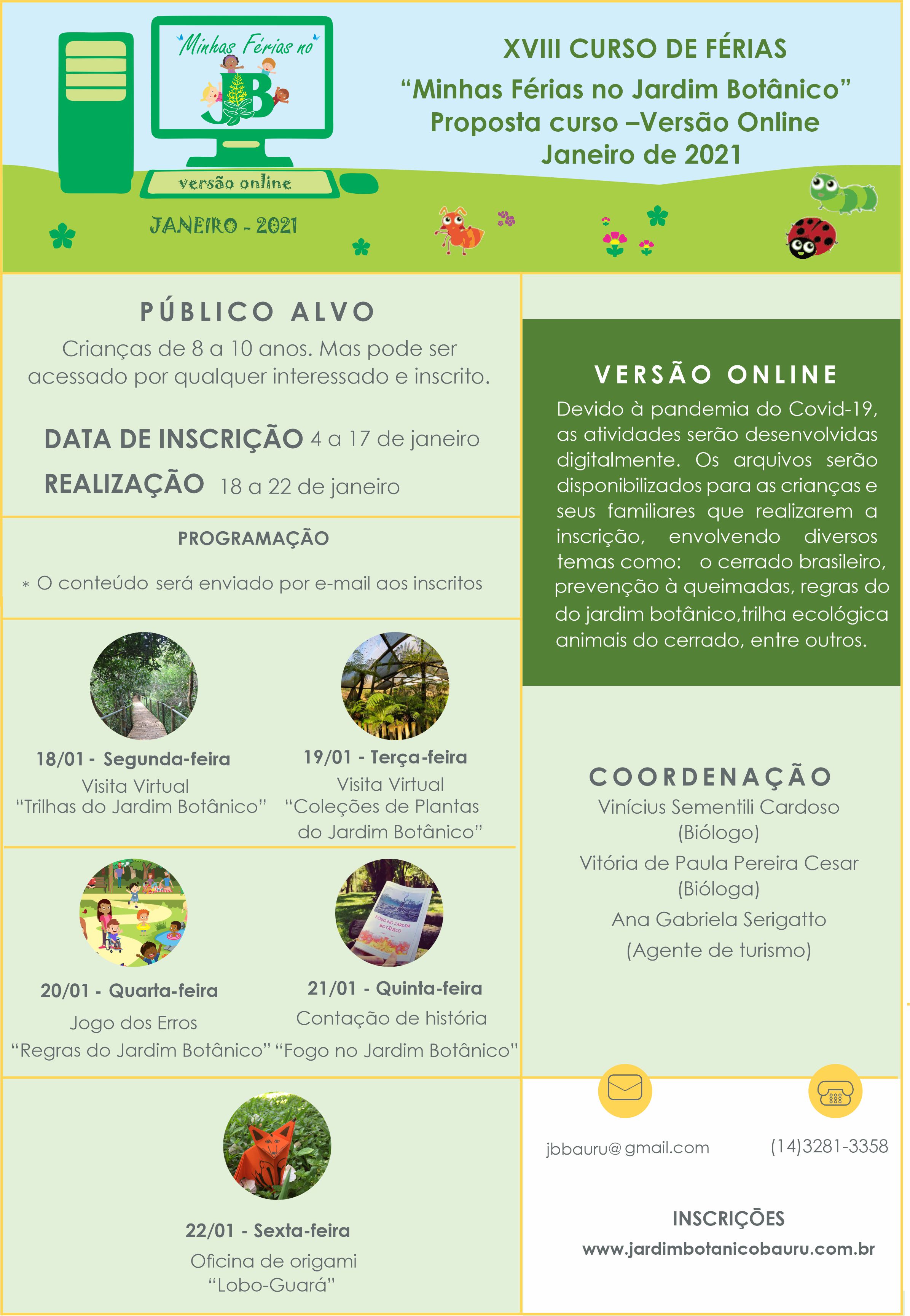 O Jardim Botânico de Bauru oferece de 18 a 22 de janeiro o 18º Curso de Férias para crianças. Com atividades lúdicas, o curso tem como tema "Minhas Férias no Jardim Botânico" e visa aproximar os pequenos do universo da biologia.
