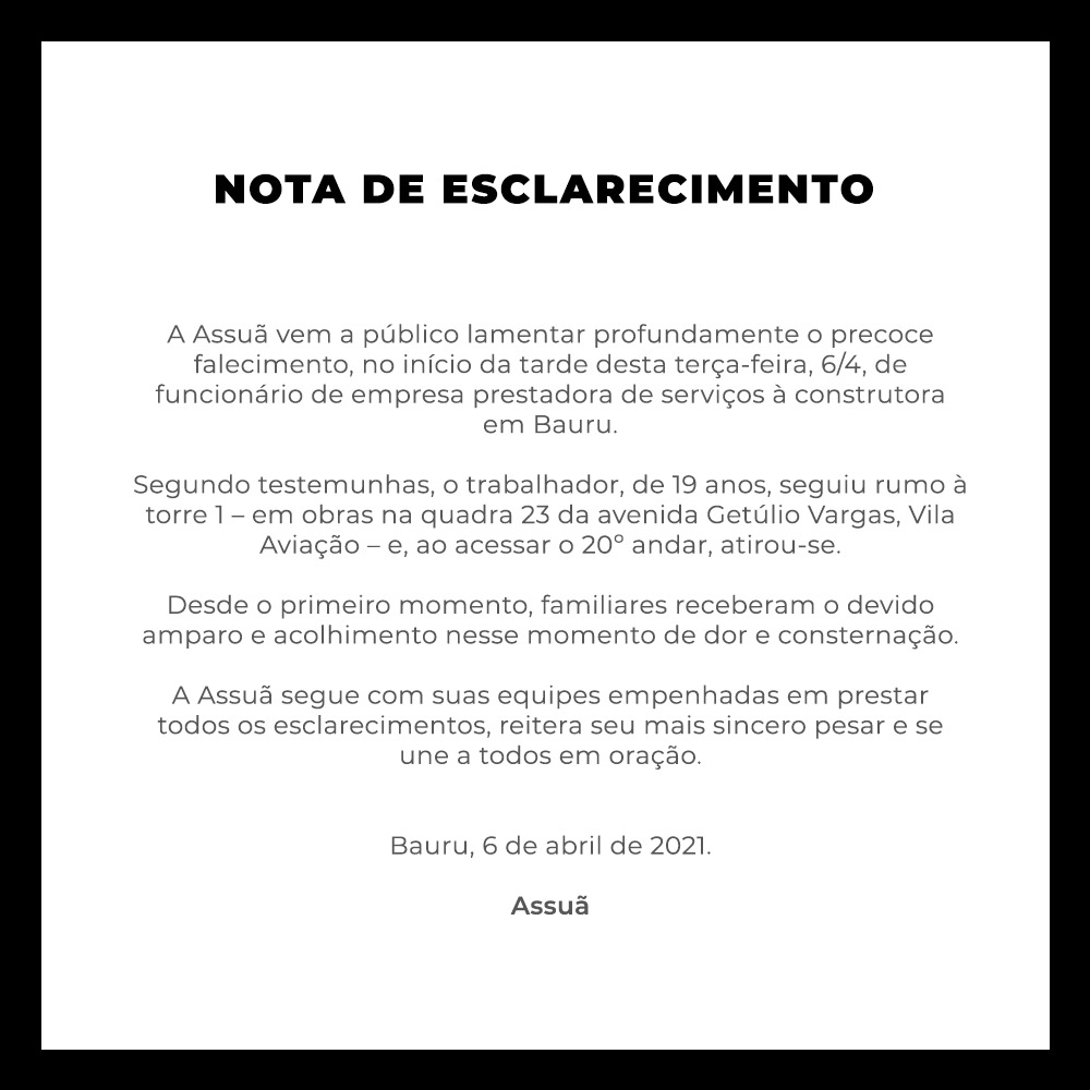 Após o ocorrido, a Assuã publicou uma nota de esclarecimento onde lamenta profundamento o falecimento do colaborador esclarece que desde o primeiro momento os familiares e receberam amparo e acolhimento no que chamou de "momento de dor e consternação". A construtora diz que segue com suas equipes empenhadas em prestar todos os esclarecimentos e reitera seu mais sincero pesar.