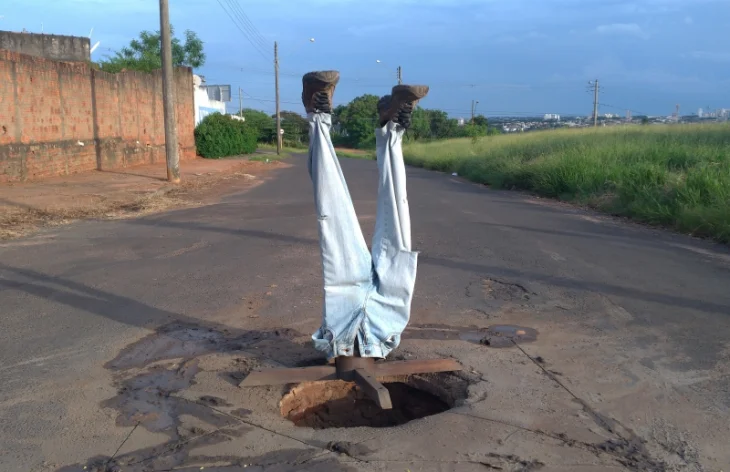 Para chamar a atenção do Poder Público, moradores do Núcleo Nobuji Nagasawa fizeram uma intervenção urbana: em um buraco na quadra 2 da Rua Júlio Rodrigues, com um par de sapatos e uma calça, fizeram um boneco de cabeça para baixo.