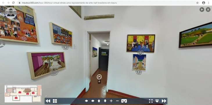É possível acessar a exposição pelo endereço https://www.meutour360.com/tour-360/tour-virtual-dinda-uma-representante-da-arte-naif-brasileira-em-bauru a partir do smartphone, tablet ou notebook.