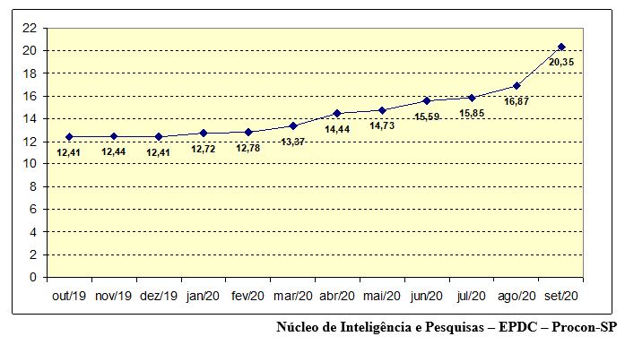 A maior variação mensal do ano de 2020 ocorreu em setembro, 21% (tomando-se como base o mês de agosto/20). O pacote que custava R$ 16,87 em agosto passou para R$ 20,25 em setembro. A pesquisa foi realizada em 40 supermercados distribuídos nas cinco regiões do município de São Paulo e abrange 39 itens dos grupos de alimentos, higiene pessoal e limpeza doméstica.