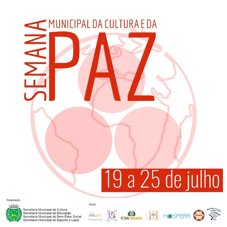 A Secretaria de Cultura, em parceria com as secretarias municipais do Bem-Estar Social, de Educação e do Esporte e Lazer, realiza a Semana Municipal da Cultura e da Paz. O evento ocorre entre os dias 19 e 25 de julho e conta com atividades variadas nos formatos virtual e presencial.