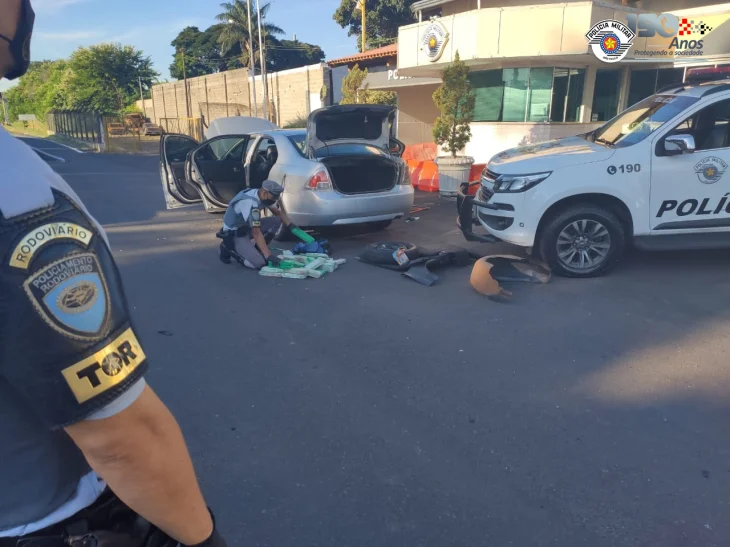 Durante vistoria minuciosa foram localizados, junto à soleira das portas laterais do carro, 44 tabletes de maconha, totalizando 29,4 quilos. O celular do condutor e R$ 200 também foram recolhidos. Os materiais foram encaminhados à perícia.