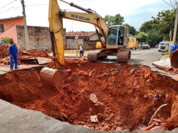 Equipes da Divisão de Drenagem, da Secretaria de Obras trabalham na reconstrução da caixa de centro e reassentamento de tubos de Ø 1,20 e Ø 0,60, de diâmetro, enquanto a Divisão Técnica do DAE recupera as redes de água e de coleta de esgoto.