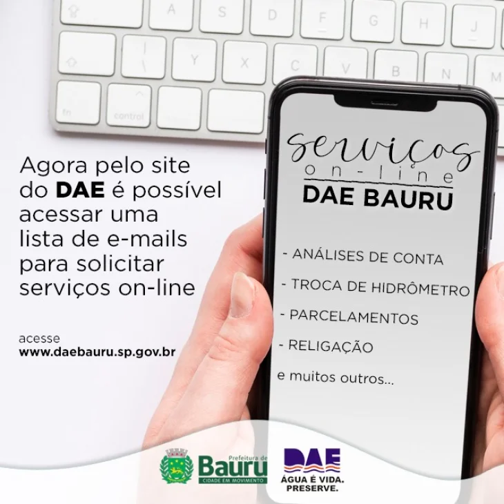 As opções de serviços online incluem “análises de contas de água”, solicitação de troca de hidrômetro”, “parcelamentos”, religação de água”, dentre outros. Todo processamento e comunicação com o requerente será feita por meio eletrônico, incluindo o envio de documentos e emissão de guias de pagamentos. O interessado em acessar os serviços deve entrar no site do DAE – www.daebauru.sp.gov.br – e clicar na aba “orientações ao consumidor”, onde aparecerão os e-mails correspondentes aos serviços pretendidos. Para prosseguir com a solicitação, o consumidor deverá constar no corpo do e-mail o nome completo do requerente, número do CPF, endereço do imóvel que deseja o serviço, tipo de serviço pretendido e as documentações exigidas.