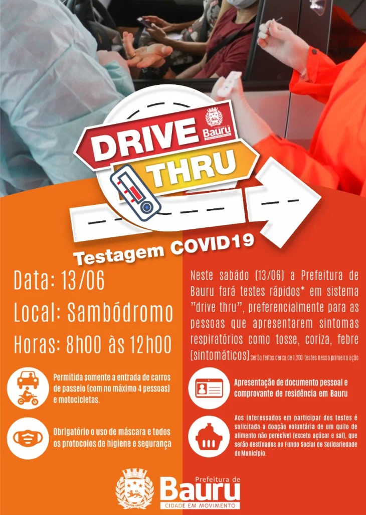 A previsão é que sejam realizados 1.200 testes a bauruenses, preferencialmente para os usuários que apresentarem sintomas respiratórios como tosse, coriza, febre (sintomáticos). Aos interessados em participar dos testes é solicitada a doação voluntária de um quilo de alimento não perecível (exceto açúcar e sal). Será necessária a identificação com documento pessoal e comprovante de residência em Bauru, uma vez que a testagem será destinada apenas para moradores da cidade.