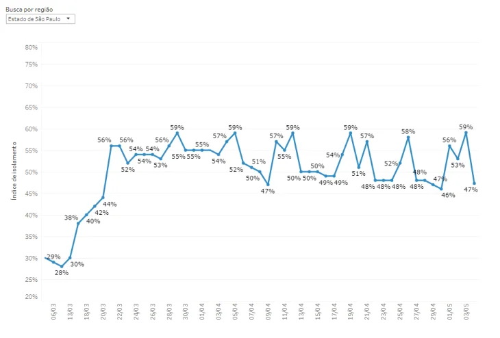 O Sistema de Monitoramento Inteligente (SIMI-SP) do Governo de São Paulo mostra que o percentual de isolamento social no Estado foi de 47% nesta segunda-feira (4). A central de inteligência analisa os dados de telefonia móvel para indicar tendências de deslocamento e apontar a eficácia das medidas de isolamento social.