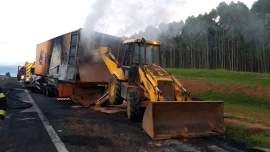 Regional 31/03/2021 Carreta com contêineres pega fogo em rodovia de Botucatu; Fogo leva 7 horas para ser controlado
