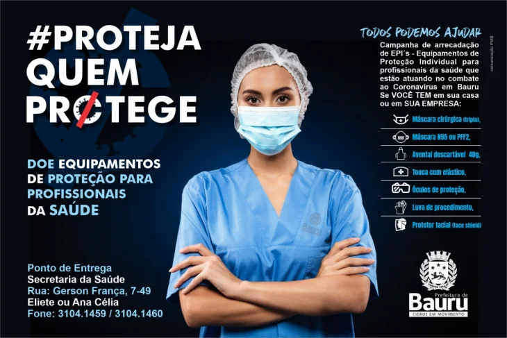 A Secretaria Municipal de Saúde, lança nesta segunda-feira (06), a campanha  "PROTEJA QUEM PROTEGE". O objetivo é apoiar o trabalho dos profissionais da área de saúde e arrecadar equipamentos de proteção individual.