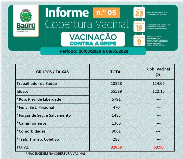 Nestes casos não tem como estipular um percentual da cobertura vacinal porque não há estimativa dos públicos-alvo. Também vale ressaltar que foi encerrada na última quinta-feira (30) a vacinação domiciliar de idosos e profissionais da saúde.